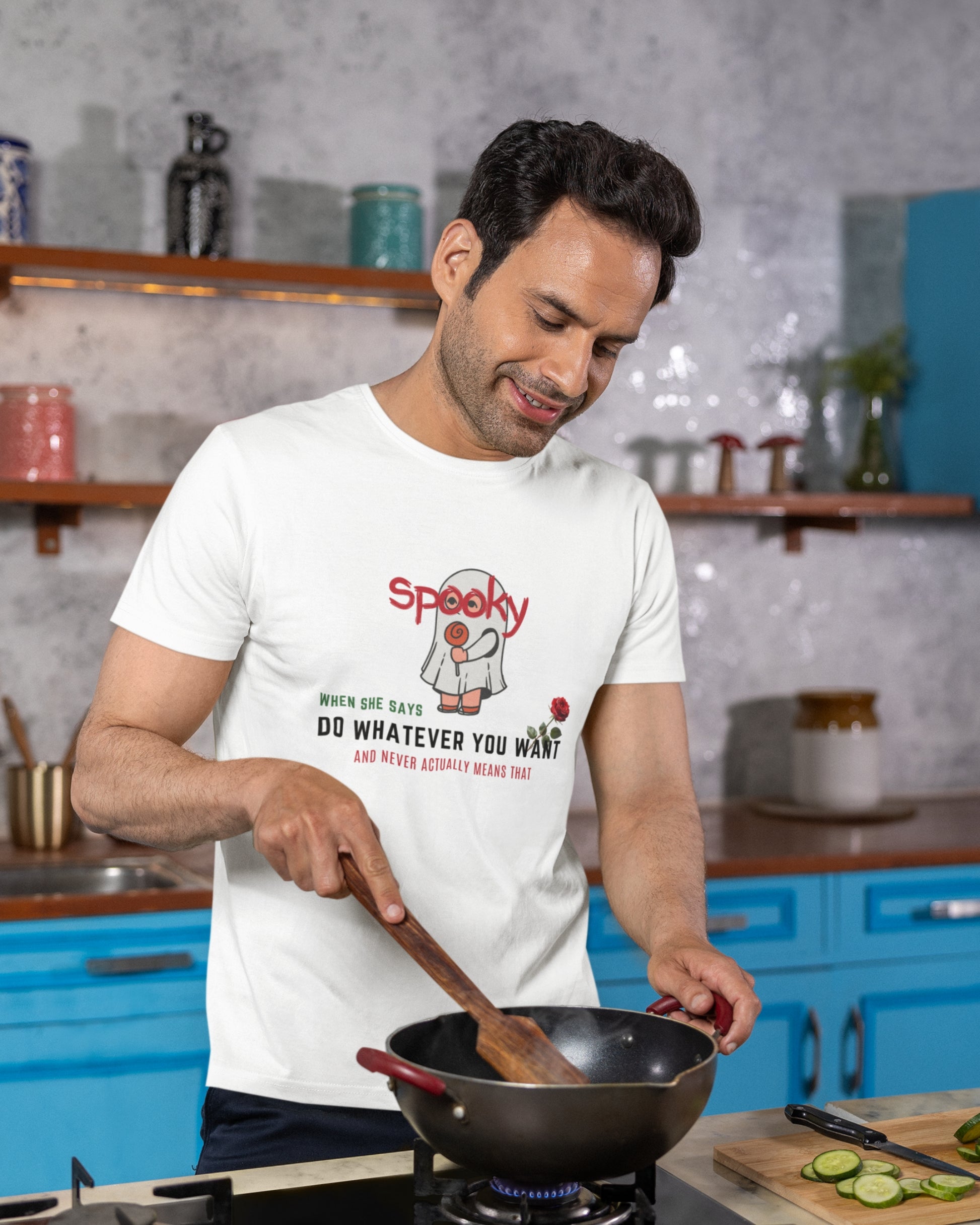 Crafted from premium pima cotton, this ultra-soft and durable men’s t-shirt delivers unmatched comfort with a touch of humor. Featuring the witty "Spooky – When she says, do whatever you want and never actually means that" print, it’s perfect for those who know the real meaning behind those words!